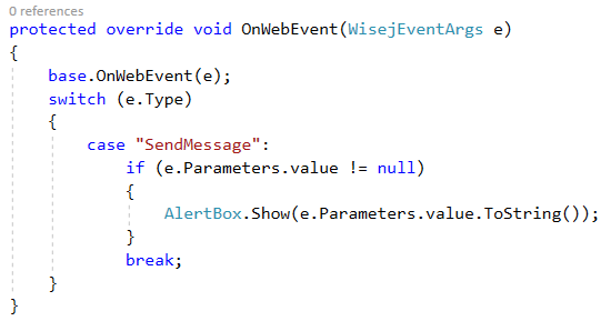 - We also want to handle the event, so you need to override the OnWebEvent method: